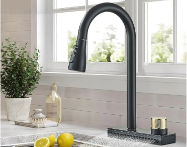 Black Kitchen Faucet With Rainfall Waterfall Wash 4 Function Brass Single Hole Pull Out Mixer Hot Cold Water Taps Deck Mounted