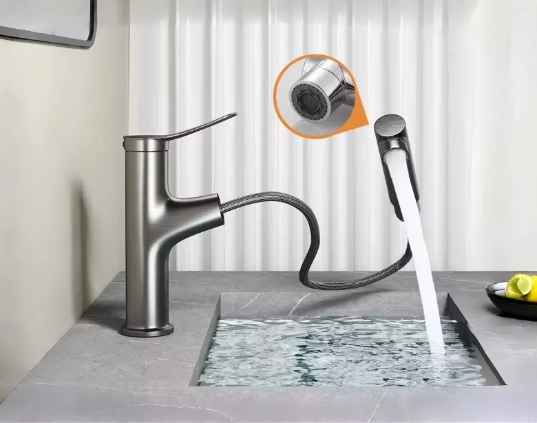 Bathroom Sink Pull-out Hot and Cold Water Mixer Faucet for Bathroom Grey/Chrome 3 Functions Mouthwash Faucet Deck Mount